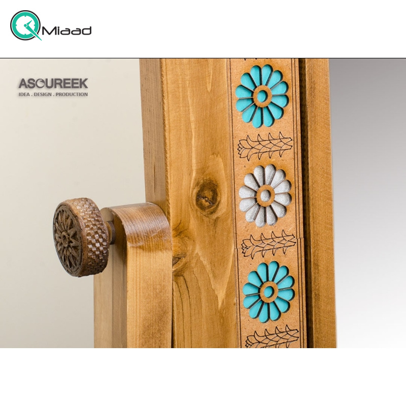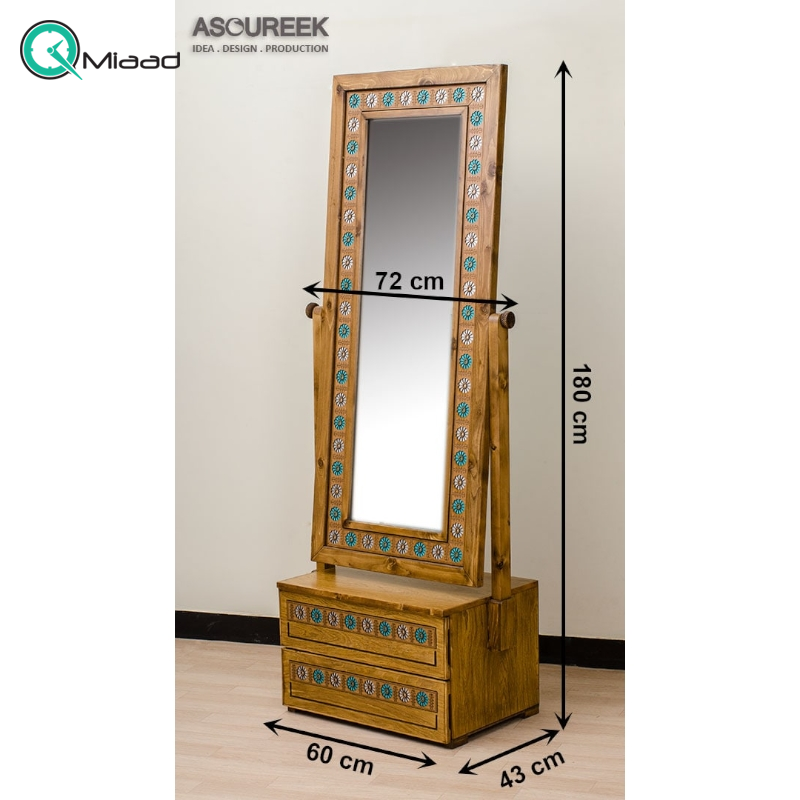 آینه چوبی و بسیار زیبا و ساده که سایز نسبتا مناسبی دارد و به صورت قدی می توانید از این آینه استفاده کنید. جنس این آینه، شیشهای بوده و حاشیه بینظیر آن از جنس چوب است که نمای شیک و خاصی را به دکوراسیون محیط اطراف شما میبخشد. از موارد كاربرد این آینه میتوان به استفاده از آن در فضاهاي داخلي، سالنها، محیطهای لوکس و لاکچری مسكوني، تجاري، اداري، سالنهای زیبایی، آتلیهها و تالارهاي لوكس پذيرايي و… اشاره کرد. چوب بکار رفته در حاشیه این محصول از چوب روسی تهیه شده از درخت نراد است.