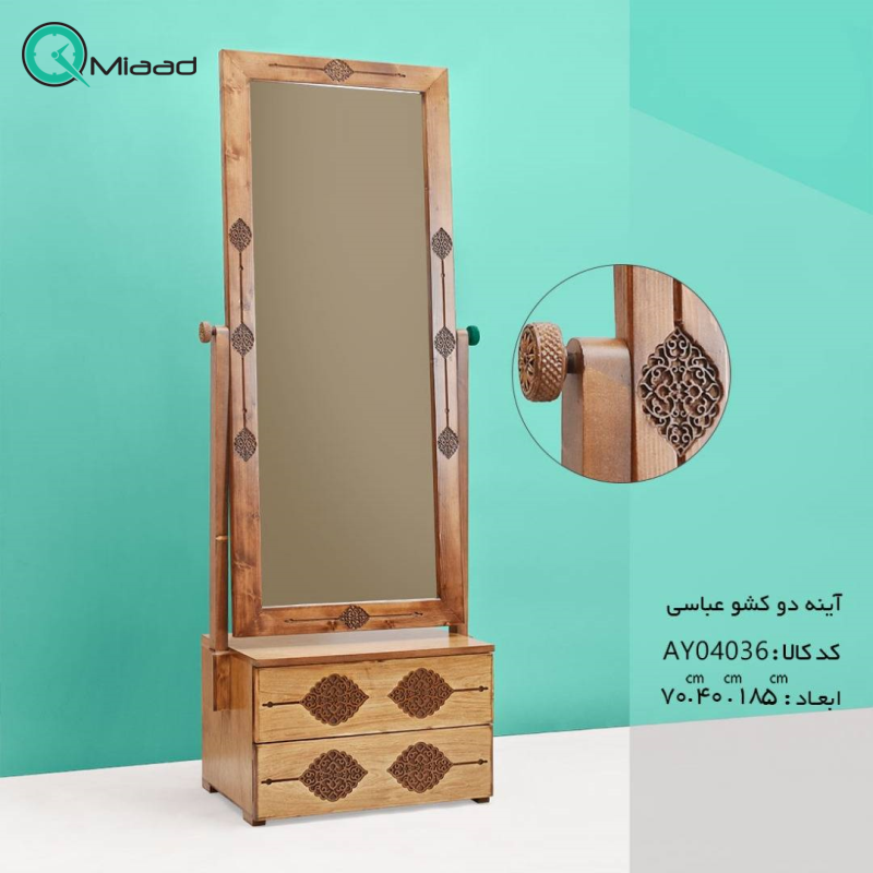 آینه دو کشو عباسی مدل AY04036، یکی از محصولات کاربردی و فوقالعادهی سری محصولات تزیینی گالری آسوریک است. حالت ایستاده این آینه با قابلیت تغییر زاویه دید برای مشاهده به صورت تمام قد، به همراه طراحی خلاقانه کشوهای تعبیه شده در قسمت پایین آن، این محصول را متمایز گردانده است. جنس این آینه، شیشهای بوده و حاشیه بینظیر آن از جنس چوب است که با طراحی زیبا نمای شیک و خاصی را به دکوراسیون محیط اطراف شما میبخشد. از موارد کاربرد این آینه میتوان به استفاده از آن در فضاهای داخلی، سالنها، محیطهای لوکس و لاکچری مسکونی، تجاری، اداری، سالنهای زیبایی، آتلیهها و تالارهای لوکس پذيرايي و… اشاره کرد. چوب بکار رفته در حاشیه این محصول از چوب روسی تهیه شده از درخت نراد است.