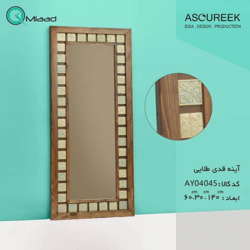 آینه قدی خشتی طلایی مدل AY04045، یکی از محصولات کاربردی و فوقالعادهی سری محصولات تزیینی گالری آسوریک است. حالت ایستاده این آینه با قابلیت تغییر زاویه دید برای مشاهده به صورت تمام قد، به همراه طراحی خلاقانه کشوی تعبیه شده در قسمت پایین آن، این محصول را متمایز گردانده است. جنس این آینه، شیشهای بوده و حاشیه بینظیر آن از جنس چوب است که با طراحی زیبا نمای شیک و خاصی را به دکوراسیون محیط اطراف شما میبخشد. از موارد کاربرد این آینه میتوان به استفاده از آن در فضاهای داخلی، سالنها، محیطهای لوکس و لاکچری مسکونی، تجاری، اداری، سالنهای زیبایی، آتلیهها و تالارهای لوکس پذیرایی و… اشاره کرد. چوب بکار رفته در حاشیه این محصول از چوب روسی تهیه شده از درخت نراد است.