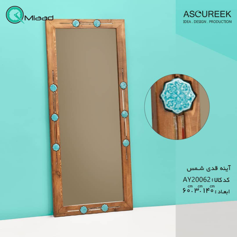 آینه قدی مدل شمس کد AY20062، یکی از محصولات کاربردی و فوقالعادهی سری محصولات تزیینی گالری آسوریک است. حالت ایستاده این آینه با قابلیت تغییر زاویه دید برای مشاهده به صورت تمام قد، به همراه طراحی خلاقانه کشوی تعبیه شده در قسمت پایین آن، این محصول را متمایز گردانده است. جنس این آینه، شیشهای بوده و حاشیه بینظیر آن از جنس چوب است که با طراحی زیبا نمای شیک و خاصی را به دکوراسیون محیط اطراف شما میبخشد. از موارد کاربرد این آینه میتوان به استفاده از آن در فضاهای داخلی، سالنها، محیطهای لوکس و لاکچری مسکونی، تجاری، اداری، سالنهای زیبایی، آتلیهها و تالارهای لوکس پذیرایی و… اشاره کرد. چوب بکار رفته در حاشیه این محصول از چوب روسی تهیه شده از درخت نراد است.