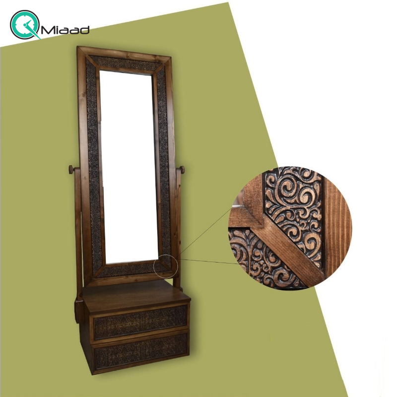 آینه ایستاده دو کشو مدل گل نقش با قاب چوبی، دارای دو کشو برای نگهداری وسایل مورد نیاز