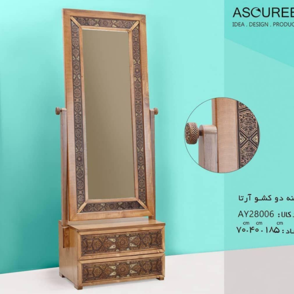 آینه چوبی و بسیار زیبا و ساده که سایز نسبتا مناسبی دارد و به صورت قدی می توانید از این آینه استفاده کنید. جنس این آینه، شیشهای بوده و حاشیه بینظیر آن از جنس چوب است که نمای شیک و خاصی را به دکوراسیون محیط اطراف شما میبخشد. از موارد كاربرد این آینه میتوان به استفاده از آن در فضاهای داخلی، سالنها، محیطهای لوکس و لاکچری مسكوني، تجاري، اداري، سالنهای زیبایی، آتلیهها و تالارهاي لوكس پذيرايي و… اشاره کرد. چوب بکار رفته در حاشیه این محصول از چوب روسی تهیه شده از درخت نراد است. این آینه به دو کشو مجهز شده است که می توانید وسایل مورد نیاز را در این کشوها نگهداری کنید.
