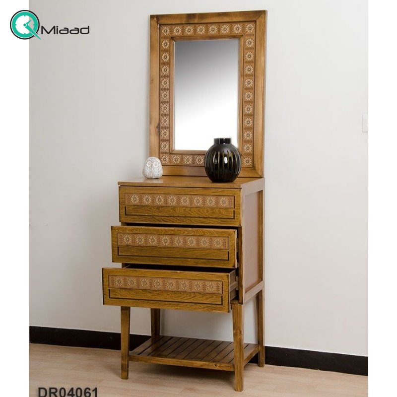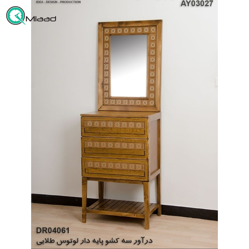 دراور سه کشو پایه دار و آینه لوتوس کد DR04061 یک میز و آینه زینتی است که می تواند مکانی برای نگهداری وسایل تزیینی در اختیار شما قرار دهد. همچنین آینه مخصوص هم در کنار این میز تعبیه شده تا بتوانید نهایت بهره را ببرید.