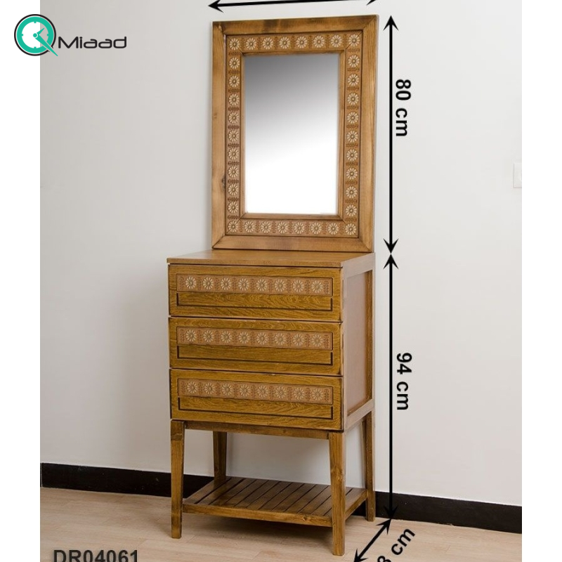 دراور چوبی طرح ساده و در عین حال زیبا که میتواند فضا مناسب برای نگه داری تلفن یا هر وسیله دیگری باشد. همچنین آینه ای هم که می تواند کارایی این ست را تکمیل کند. این محصول به دلیل ابعاد و اندازه مناسب می تواند در مکان های مختلفی در سراسر خانه یا محل کار شما قرار گیرد تا زیبایی فضا را بهبود بخشد. از سه کشو این دراور می توان برای نگهداری وسایل کوچک و کاربردی استفاده کرد.
