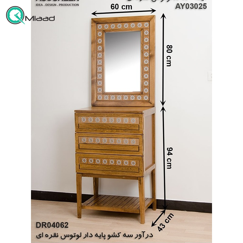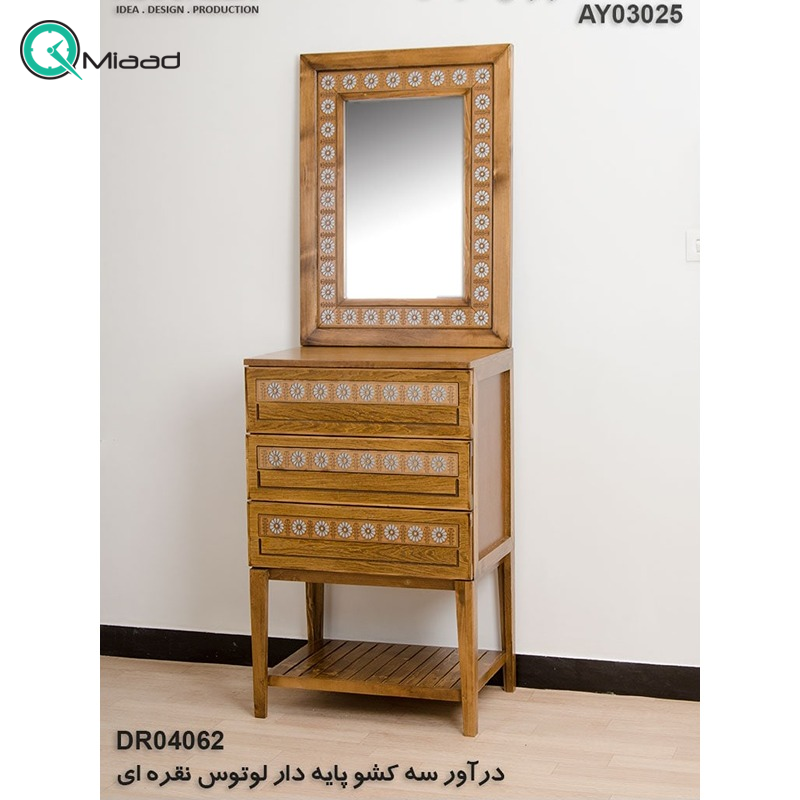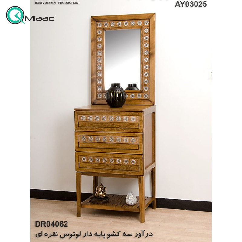 دراور سه کشو و آینه لوتوس کد DR04062 رنگ نقره ای یک میز و آینه زینتی است که می تواند مکانی برای نگهداری وسایل تزیینی در اختیار شما قرار دهد. همچنین آینه مخصوص هم در کنار این میز تعبیه شده تا بتوانید نهایت بهره را ببرید.