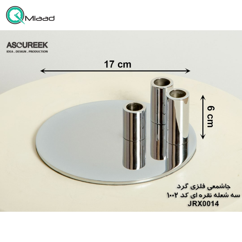جاشمعی با طراحی گرد، دارای سه شعله و فضا برای نگه داری شمع، متریال فلزی براق، استفاده تزیینی و کاربردی به عنوان شمعدان، رنگ نقره ای