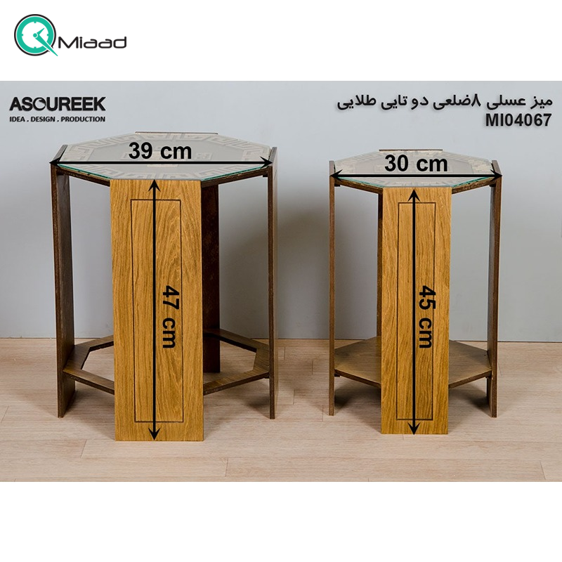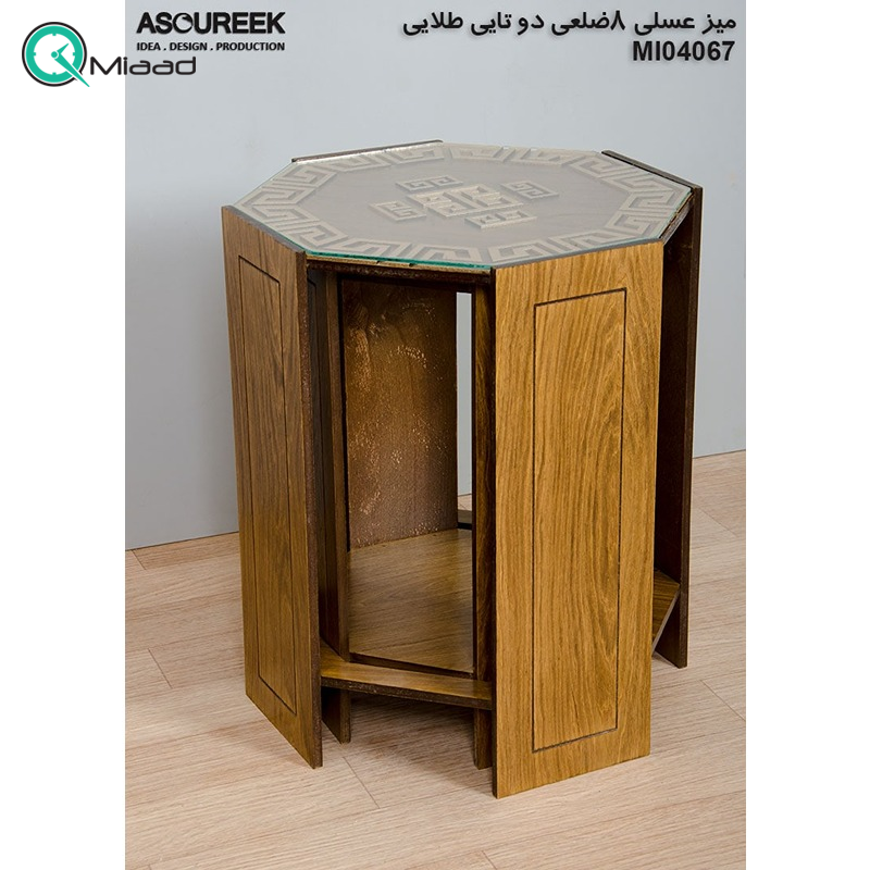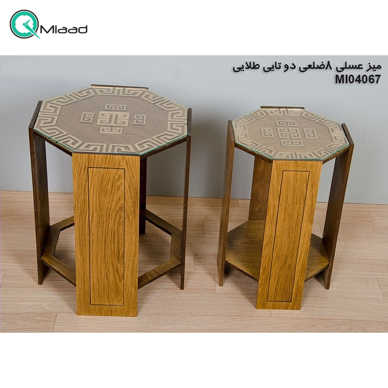 میز عسلی چوبی دو تکه مدل M104067 رنگ طلایی از سری میز های وب سایت میعاد تایم می باشد.