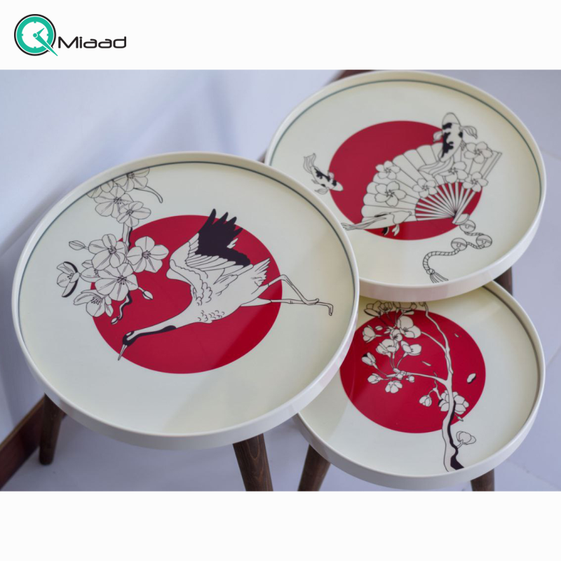 میز عسلی چوبی سه تکه طرح دار کد M104074 از سری میز های وب سایت میعاد تایم می باشد.