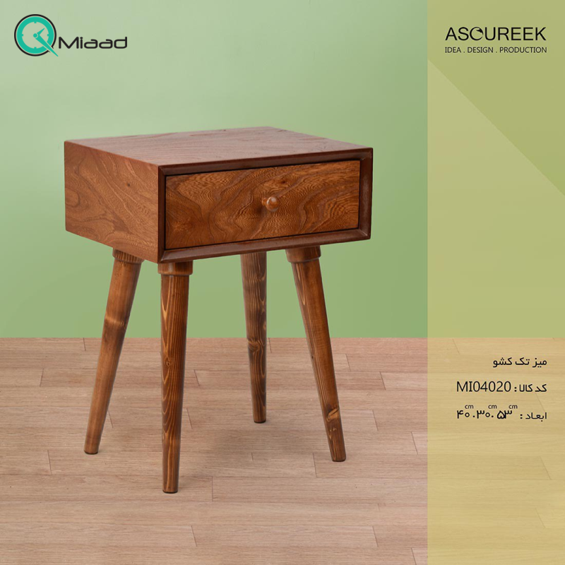 میز تک کشو پایه دار کد MI04020 یک میز زینتی است که می تواند مکانی برای نگهداری وسایل تزیینی در اختیار شما قرار دهد. دراور به شما فضایی برای نگه داری وسایل و البسه و سایر موارد را در اختیار شما قرار می دهد.