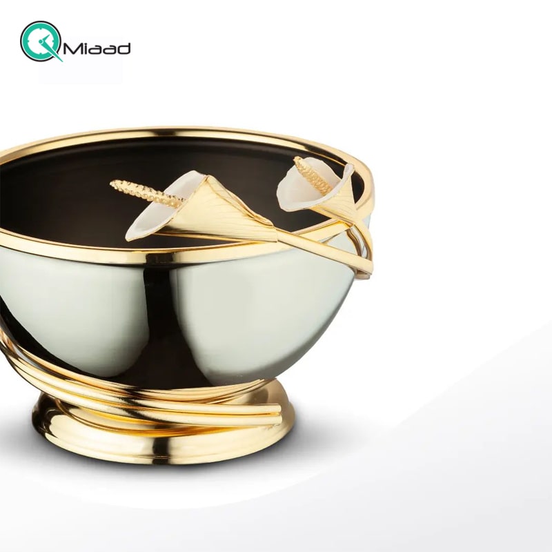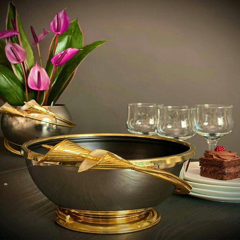 - ظروف پذیرایی بنیکو با ترکیب استیل و برنج با اون گل شیپوری خوشگلی که داره به میز پذیرایی جلـوه خیلی شیک و متفاوتی میده