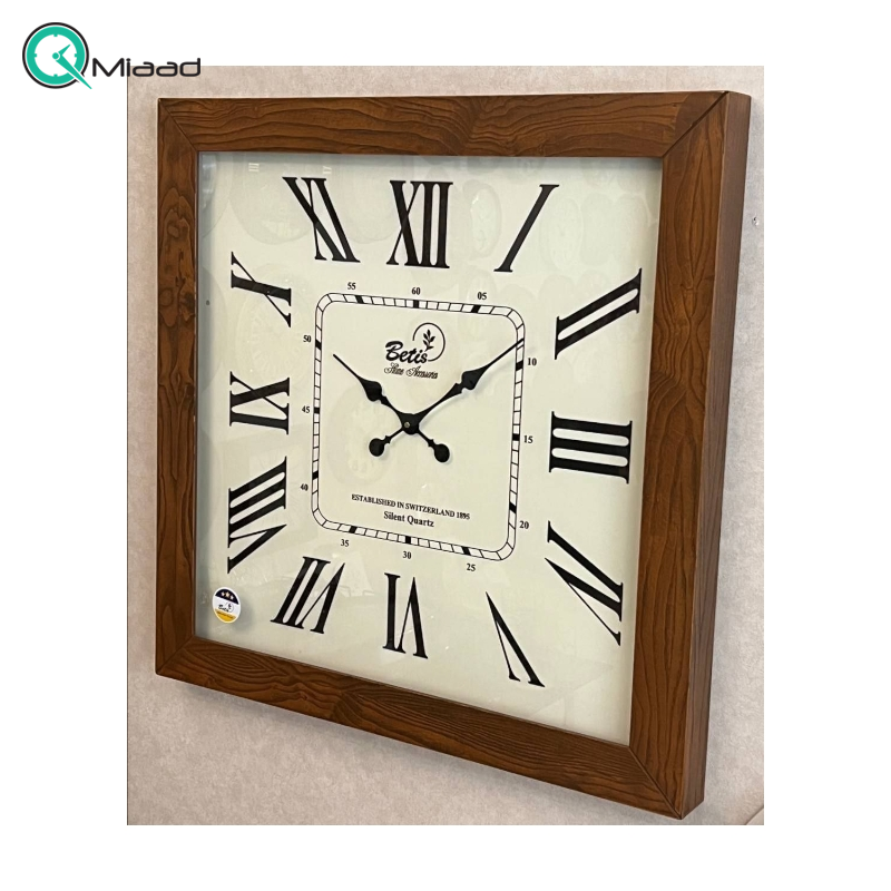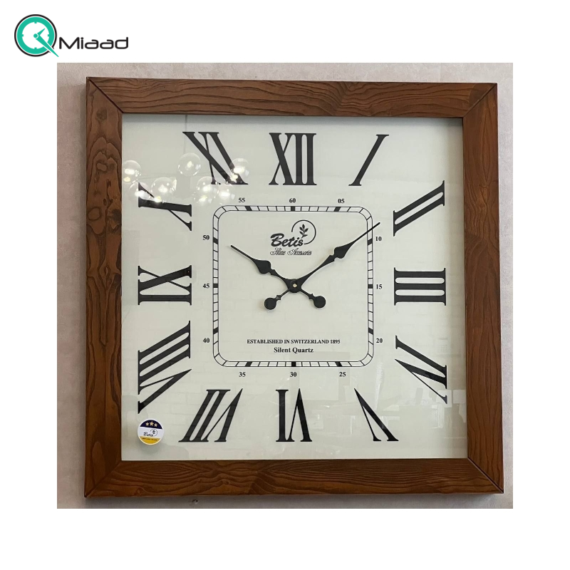 ساعت دیواری چوبی بتیس مدل 7010، ساعت دیواری چهارگوش با متریال تمام چوب، سایز 70، موتور تایوانی با صفحه زیبا و خوانا، دارای اعداد رومی رنگ مشکی