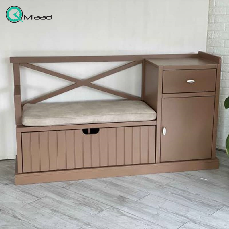 جاکفشی چوبی، جاکفشی با متریال و روکش چوبی، تکیه گاه برای برای راحتی در پوشیدن کفش، یک کشو و دو فضا مناسب برای نگه داری کفش‌ها و وسایل