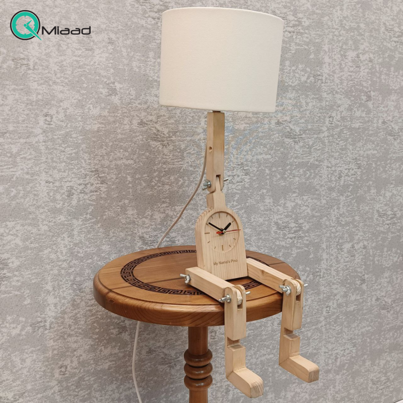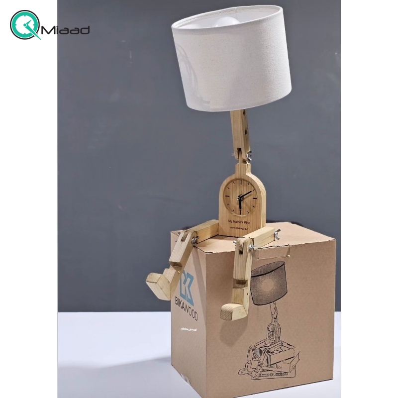 آباژور خلاقانه چوبی مدل پینو، آباژور تزیینی و دکوری با طراحی خلاقانه یک آدمک چوبی، مناسب کتابخوانی، یک ساعت ظریف در بدنه آباژور