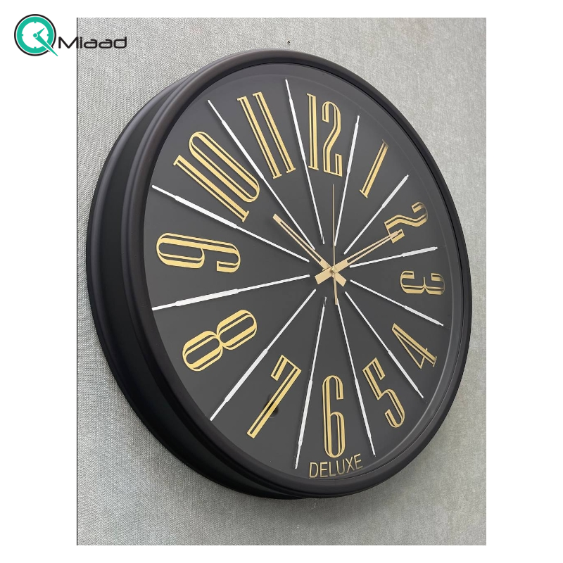 ساعتی بسیار زیبا و مینیمال با ترکیب رنگ مشکی طلایی از برند دلوکس که می تواند هر دیوار خالی را زیباتر کند. صفحه مشکی با جزییات روی صفحه ساعت و بدون هر جزییات اضافی به چشم نواز شدن این محصول کمک کرده است. این ساعت و تمام جزییات خیلی ظریف طراحی و تولید شده است. فونت لاتین اعداد روی صفحه ساعت بسیار چشمگیر و نوین می باشد و این ساعت مدرن را زیباتر کرده است. همچنین خطوط روی صفحه ساعت هم که اعداد را از هم جدا کرده است یه نظم خاصی را در صفحه ساعت ایجاد کرده است.