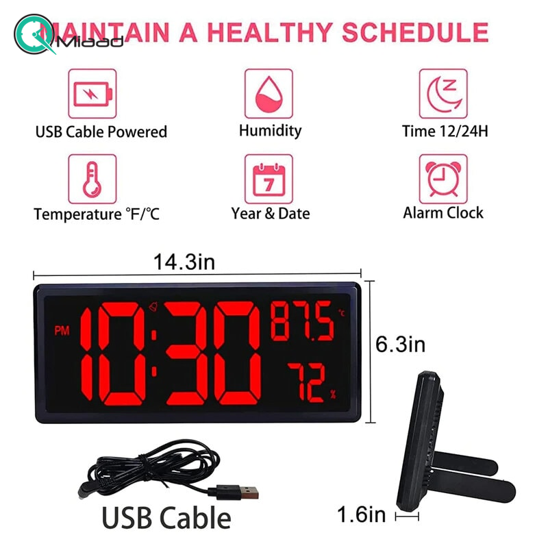این ساعت واضح و چشم نواز است و شما می توانید به راحتی زمان را از فاصله 10 متری تشخیص دهید. همین امر هم باعث می‌شود که کودکان و سالمندان به راحتی ساعت را تشخیص دهند. نور این ساعت به 4 روش قابل تنظیم است و بر اساس محیط و سلیقه شما میتواند به روش های مختلف و به میزان مورد نیاز شما تنظیم شود. حتی یک مدل تنظیم نور اتوماتیک دارد که باعث‌میشود بر اساس زمان و نور محیط ساعت تنظیم شود. ساعت دیواری دیجیتال با صفحه نمایش بزرگ چند منظوره با کابل USB 37.5 اینچی، قابلیت هایی مختلفی را پوشش می دهد مانند: زمان، تاریخ، رطوبت، دما، زنگ هشدار که از قابلیت های این ساعت دیجیتال بی‌نظیرمحسوب می‌شود.