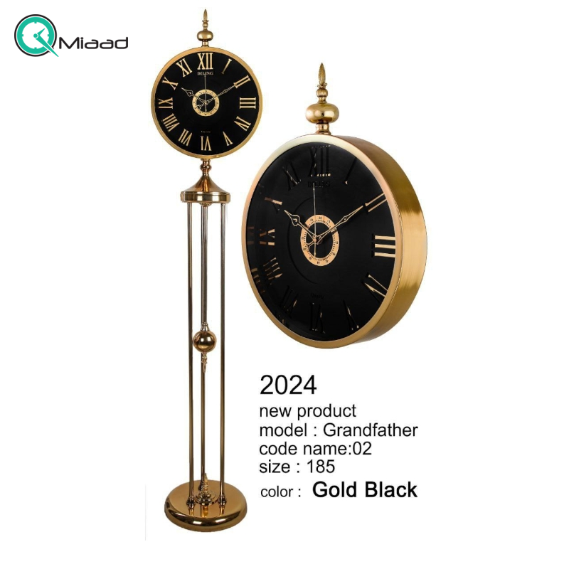 ساعت ایستاده دیلینگ مدل 02، ساعت ایستاده سالنی برند دیلینگ، با ساختاری مدرن و جذاب، فریم از فلز آبکاری شده درجه یک، رنگ طلایی صفحه مشکی