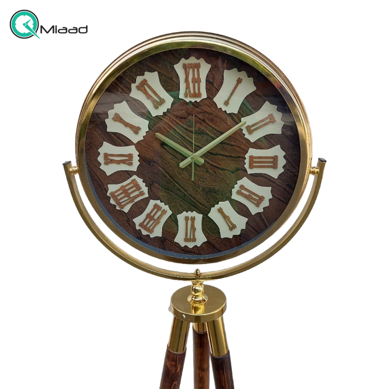 این ساعت ایستاده، دارای سه پایه است که می تواند کنار هر سالن و اتاقی قرار بگیرد. پایه های چوبی و بدنه فلزی و رنگ قهوه ای و طلایی، زیبایی این محصول را بیشتر کرده است. همچنین دارای موتور آرامگرد می باشد. اعداد برجسته و فونت جذاب رومی ساعت خوانایی را کامل کرده است چرا که رنگ پس زمینه هر عدد روی صفحه ساعت، سفید می باشد و خوانا تر شده است.