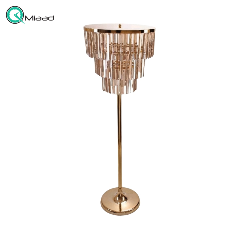 آباژور سالنی مدل 128، آباژور ایستاده با پایه آهنی، دارای 3 سرپیچ و 115 عدد آویز، همچنین قابل سفارش در دو مدل آویز دار و بدون آویز، آبکاری فورتیک بدنه، دارای تنوع رنگ بندی، رنگ طلایی