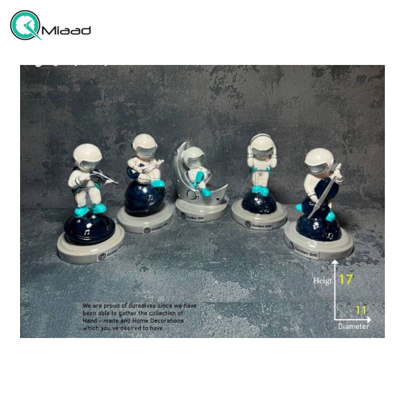 مجسمه پنج تکه طرح فضانورد کد 474 یکی از سری محصولات تزیینی کالکشن مجسمه میعاد تایم می باشد. این محصول کالکشن 5 تکه طرح فضانورد در پوزیشن های مختلف می باشد. این مجسمه از پلی رزین ساخته شده است و دارای پایه چوبی میباشد. همچنین دارای گارانتی اصالت و سلامت فیزیکی است. اگر قصد زیبا تر کردن هر سطح و میز خالی را دارید، این مجسمه می تواند انتخاب بسیار مناسبی باشد.