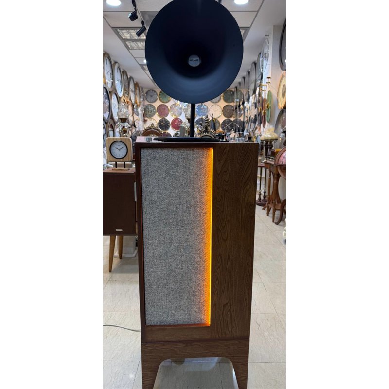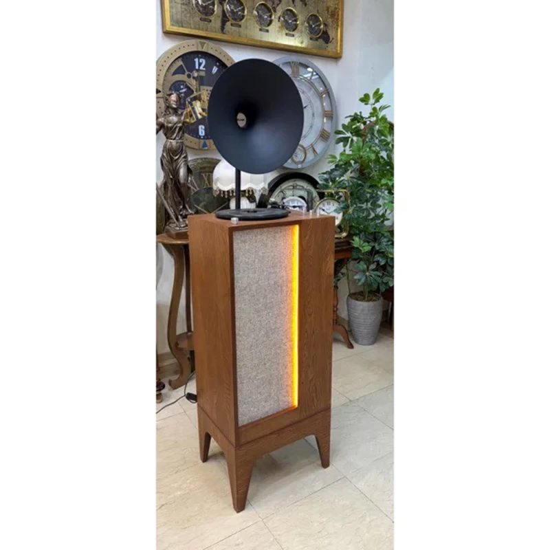 طراحی و متریال: این گرامافون با یک شیپور فلزی بزرگ به رنگ مشکی مات و یک بدنهی ایستاده از جنس چوب مرغوب به رنگ قهوهای طراحی شده است. تضاد رنگی مشکی و قهوهای، ظاهری جذاب و سنگین به آن بخشیده که کاملاً با فضای لوکس خانهها و گالریها سازگار است. قسمت جلویی بدنه ممکن است دارای نمای پارچهای یا طرح چوبی متناسب با طراحی باشد که زیبایی دستگاه را دو چندان میکند.