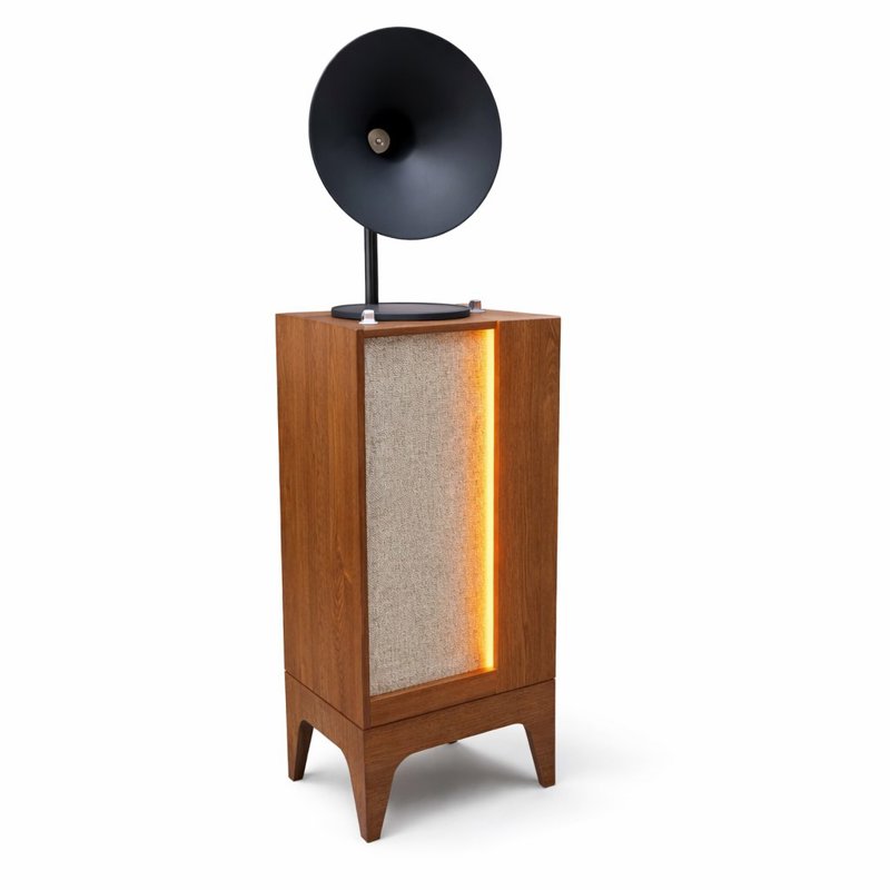 طراحی و متریال: این گرامافون با یک شیپور فلزی بزرگ به رنگ مشکی مات و یک بدنهی ایستاده از جنس چوب مرغوب به رنگ قهوهای طراحی شده است. تضاد رنگی مشکی و قهوهای، ظاهری جذاب و سنگین به آن بخشیده که کاملاً با فضای لوکس خانهها و گالریها سازگار است. قسمت جلویی بدنه ممکن است دارای نمای پارچهای یا طرح چوبی متناسب با طراحی باشد که زیبایی دستگاه را دو چندان میکند.