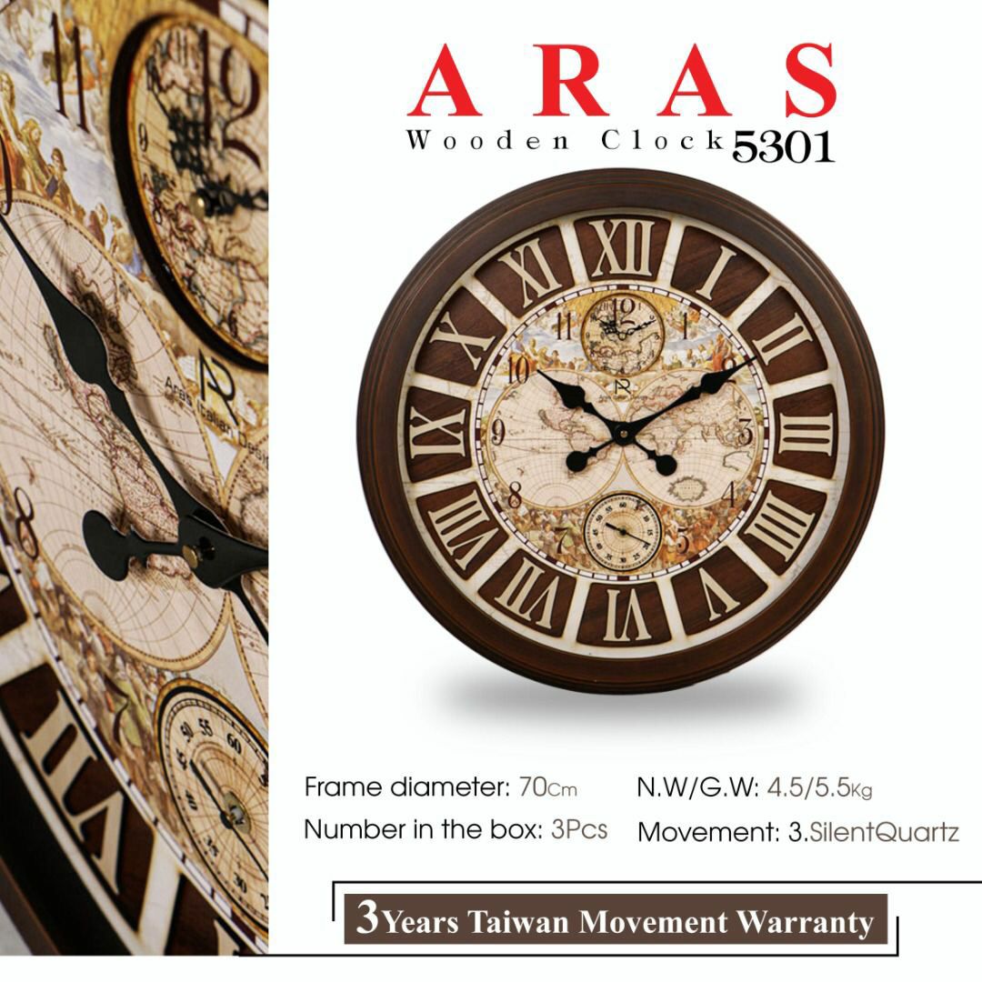 ساعت دیواری ارس مدل 5301 با بدنه چوبی با کیفیت از استحکام قابل قبولی برخوردار می باشد. طراحی اعداد بزرگ لاتین باعث خوانایی بیشتر این ساعت دیواری شده است. در طراحی صفحه این ساعت دیواری جدید بجز موتور اصلی از دو موتور دیگر که یکی از آنها ثانیه شمار است استفاده شده که زیبایی این ساعت دیواری را بیشتر کرده است. هر سه موتور این ساعت آرام گرد هستند و کیفیت بسیار بالایی دارند.