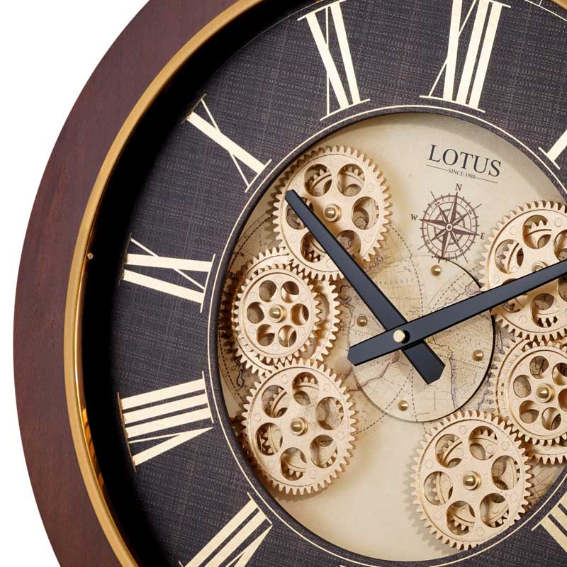 در مدل بروکلاین، چیزی که خیلی به چشم می آید ترکیب چیدمان چشمگیر چرخ دنده هاست که در یک بک گراند با نقش زیبا خودنمایی میکنند. زه فلزی طلایی آبکاری روی فریم چوبی با چرخ دنده های طلایی داخل صفحه کاملا هارمونی دارد. هشت چرخ دنده زیبا روی صفحه کاملا متحرک هستند و توسط موتور مجزا هدایت می شوند. لوتوس در جدیدترین کالکشن ساعت های چرخ دنده ای نگرانی مشتریان را از بابت موتور چرخ دنده ها رفع کرده است. موتور چرخ دنده های ساعت تحت گارانتی لوتوس است.