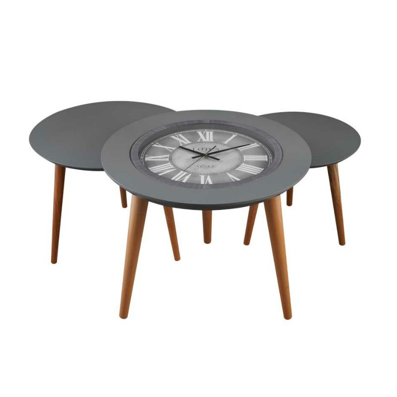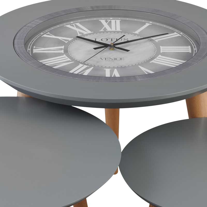 دارای 3 عدد میز عسلی، دارای ساعت و عقربه ثانیه شمار روی میز دارای پایه های چوبی پیچی، طراحی خاص با کیفیت ساخت بالا