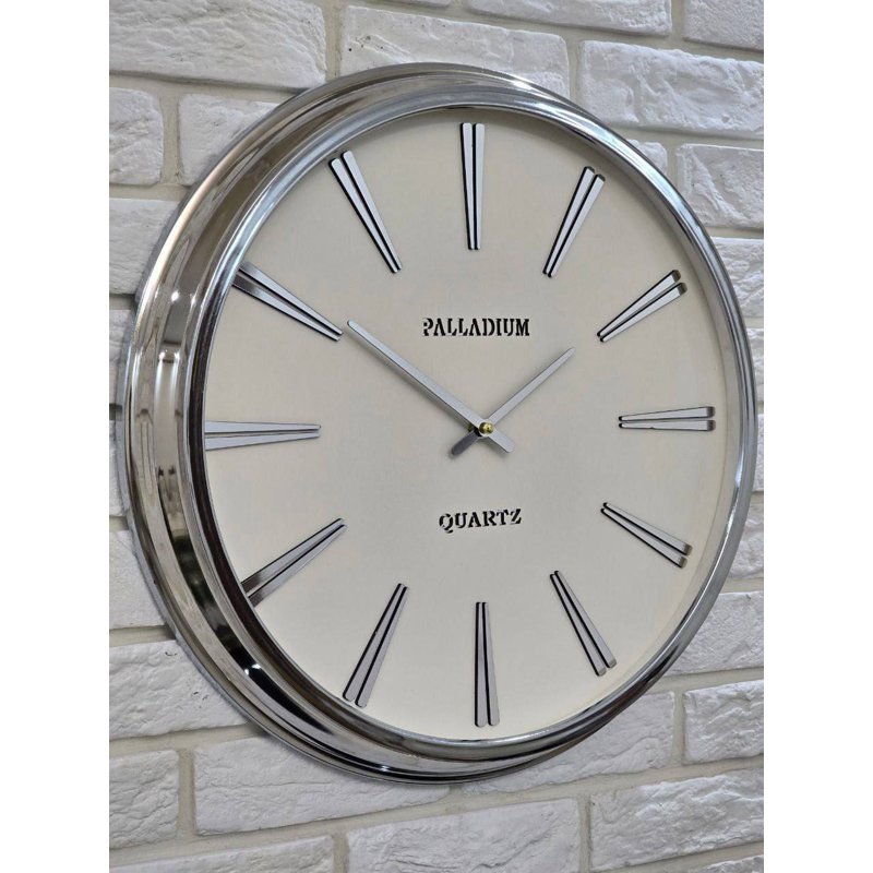 ساعت دیواری فلزی پالادیوم کد ۲۰۲۱ نقرهای با قطر ۵۵ سانت. مجهز به آبکاری کروم درجه یک و موتور آرام گرد تایوانی. تضمین کیفیت و ارسال سریع از میعاد تایم.