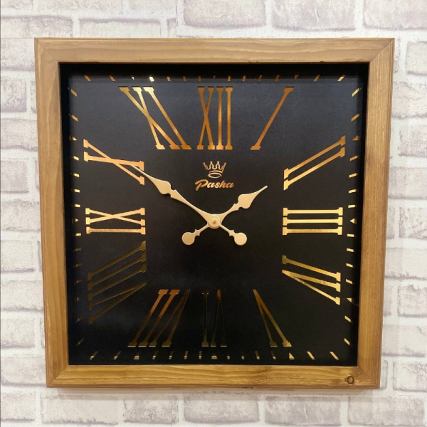 ساعت دیواری پاشا مدل 6561، ساعت دیواری با بدنه چوب طبیعی نراد روسی، موتور آرامگرد، اعداد رومی و صفحه مشکی رنگ ساعت با طراحی چهار گوش، سایز 65