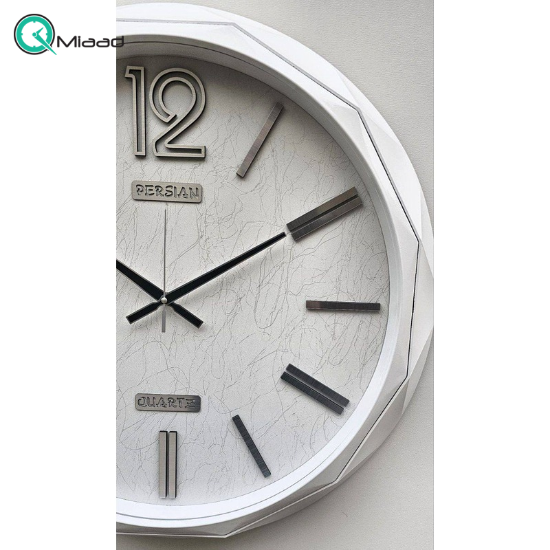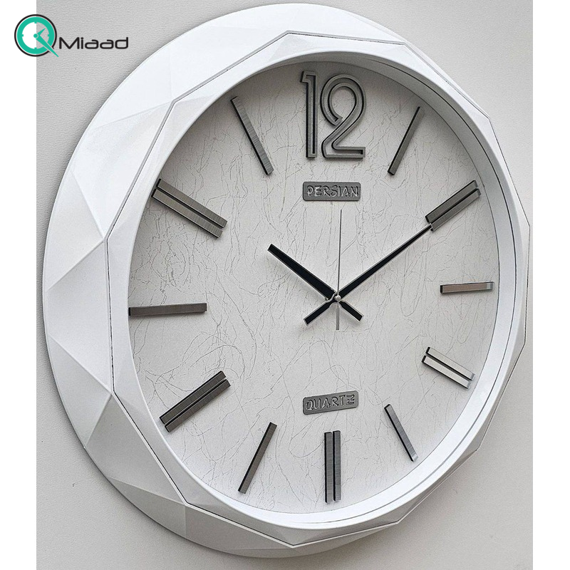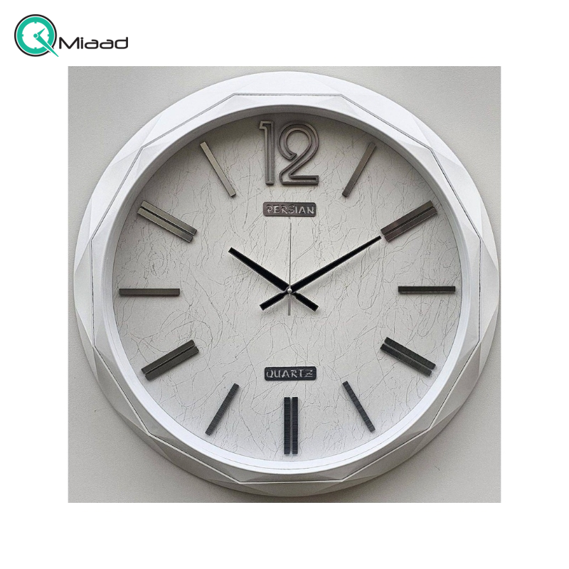 ساعت دیواری صفحه چوب پرشین مدل 704 رنگ سفید از سری ساعت دیواری های جدید میعاد تایم می باشد.