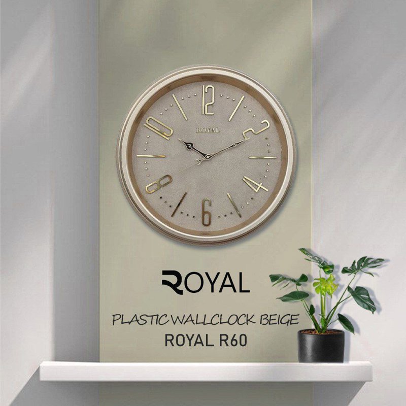 ساعت دیواری رویال سنتر مدل R60 با قطر 52 سانتیمتر و موتور آرام گرد بیصدا. دارای صفحه کاغذ دیواری و اعداد دوبل مولتی. موجود در رنگهای قهوهای، سفید، طوسی و بژ.