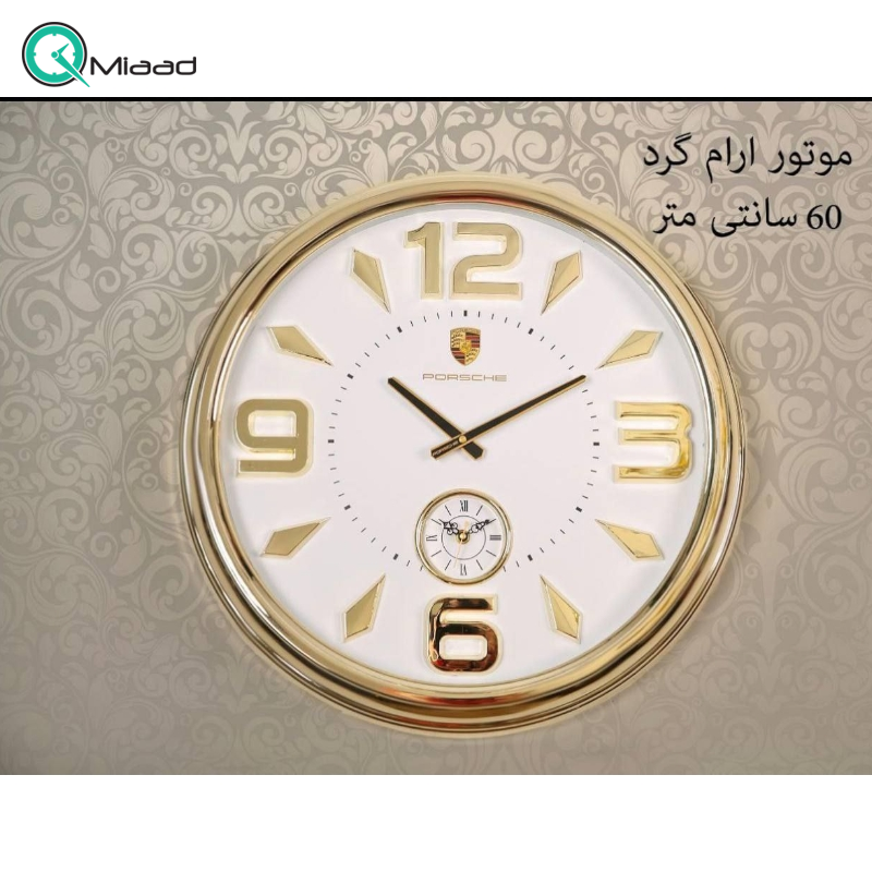 ساعت دیواری پورشه مدل 215، ساعت دیواری سایز 60 با بدنه پلاستیک و اعداد برجسته طلایی رنگ، دارای موتور ثانیه شمار مستقل، رنگ طلایی سفید