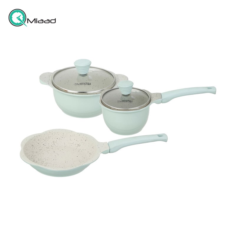 - قابلمهای از جنس چدن با درب شیشهای، شیرجوش و تابه اصلیترین موارد این سرویس پنج پارچه است.