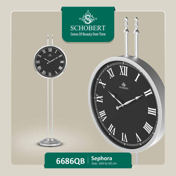 ساعت ایستاده شوبرت مدل 6686Q‌B، ساعت ایستاده فلزی کروم، قابلیت تنظیم ارتفاع، فریم از فلز آبکاری شده درجه یک، موتور آرامگرد تایوانی، صفحه سفید رنگ