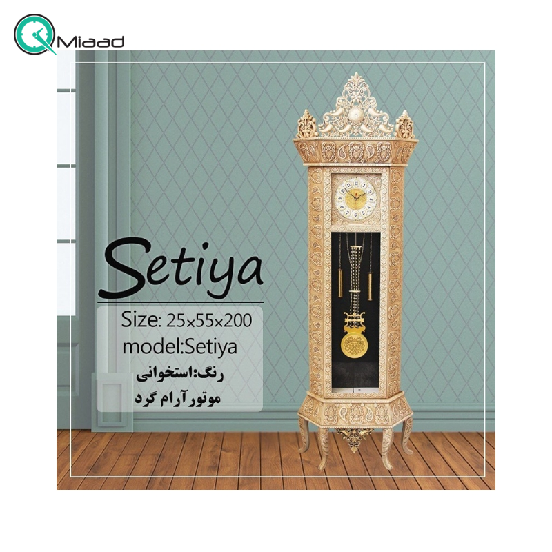 ساعت ایستاده و کنارسالنی مدل ستیا رنگ استخوانی یکی از مدل های پرطرفدار موجود در بازار است که با متریال پلاستیک طرح چوب، درب شیشه ای، زیبایی این مدل دوچندان شده است. طراحی زیبای بدنه و صفحه این مدل ساعت نگاه هر بیننده ای را در مرتبه اول به خود جلب می کند و فضای دکور منزل و یا محل کار شما را به کلی تغییر می دهد. موتور ساعت آرام گرد و تایوانی است.