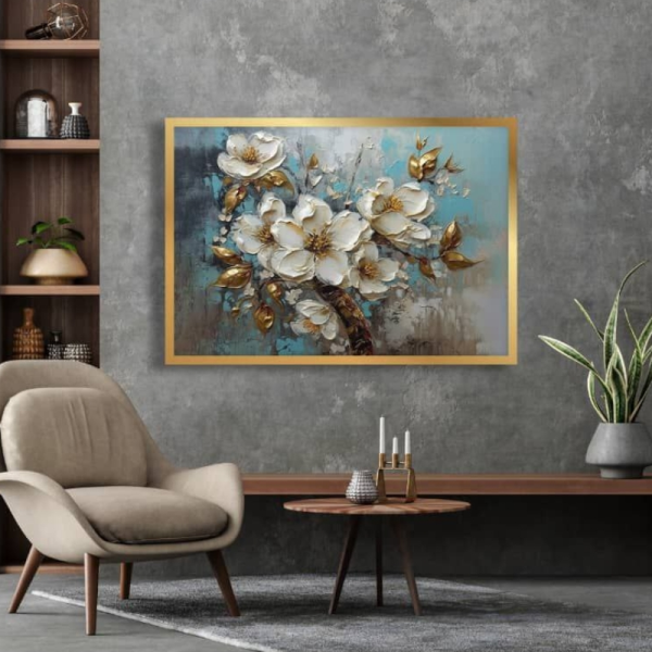 امروز برای شما یک محصول بسیار خارق العاده از سری تابلو های تزیینی میعاد تایم را موجود کرده ایم که در مورد این محصول اطلاعات بهتری را در ادامه به شما توضیح خواهیم داد. در این قسمت تابلو شاینینگ جدیدی را برای شما موجود کرده ایم. این نقاشی هنری از نظر بصری جذاب، یک الگوی انتزاعی منحصر به فرد از برگ و شکوفه سفید طلایی را به نمایش میگذارد.