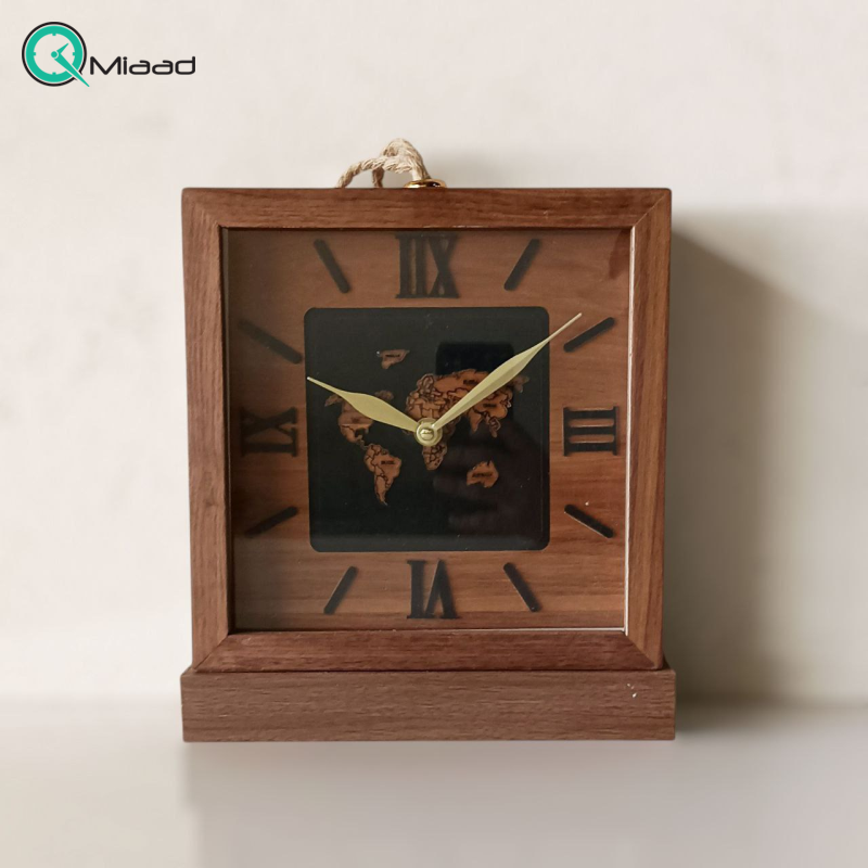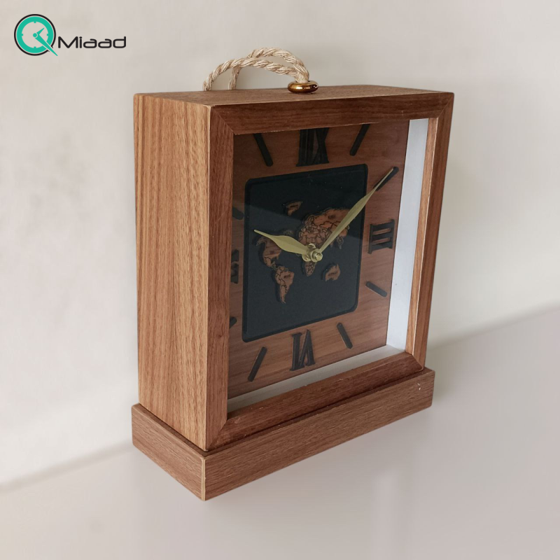 ساعت رومیزی مدل نقشه سایز کوچک، ساعت رومیزی طرح مربع با متریال ترکیبی چوب و فلز، سایز 25x33، طراحی اصیل و طبیعی