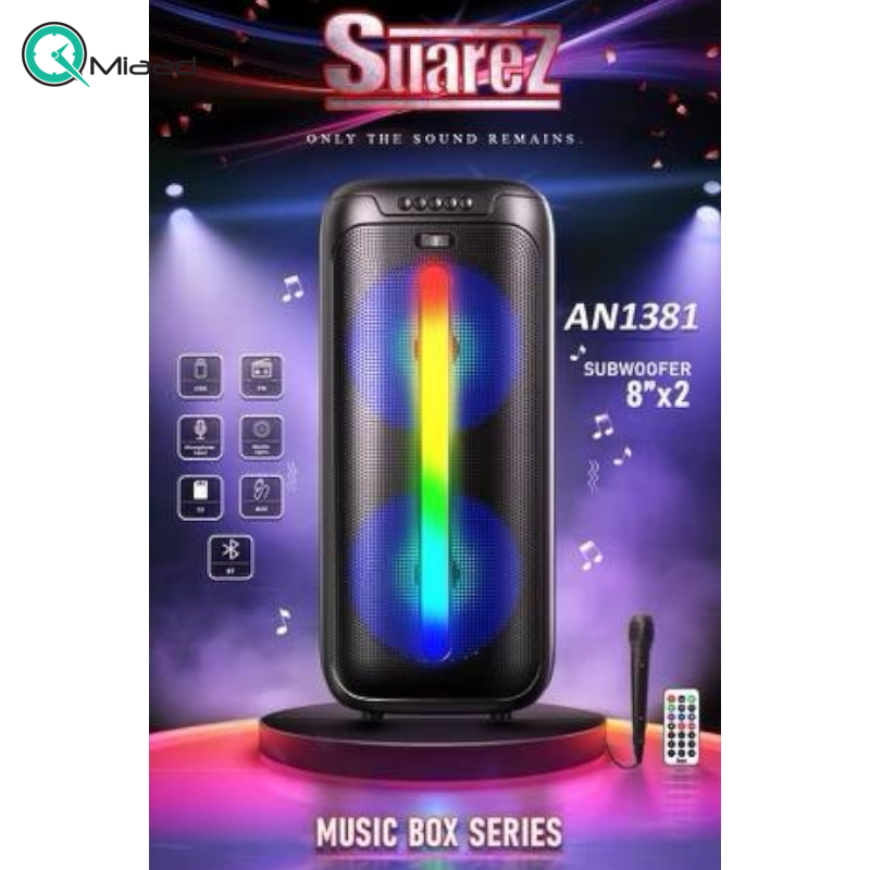 اسپیکر بلوتوث پرتابل سوارز مدل Suarez AN1381، قابلیت پشتیبانی از کارت‌های حافظه، دارای ساب ووفر 8 اینچی، اقلام همراه بلندگو ریموت کنترل میکروفن، پشتیبانی از بلوتوث