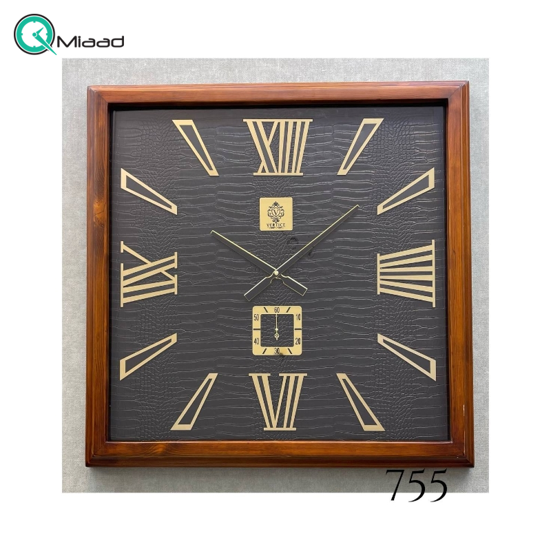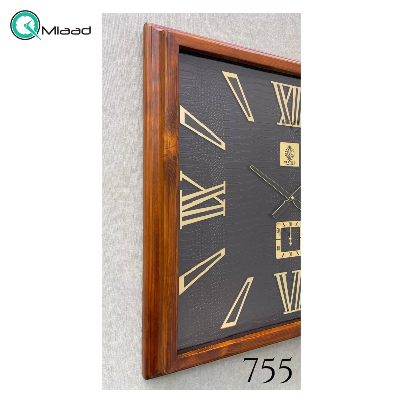 ساعت دیواری چوبی ورتیچ مدل 755، ساعت دیواری چهارگوش با متریال تمام چوب، سایز 70، موتور تایوانی با صفحه زیبا و خوانا، دارای اعداد رومی رنگ طلایی