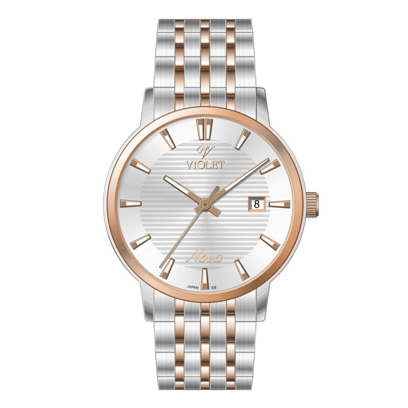 ساعت مچی ویولت، مردانه تک موتوره،گرد فلزی،دورنگ استیل رزگلد،صفحه نقره ای، کد 32762/2