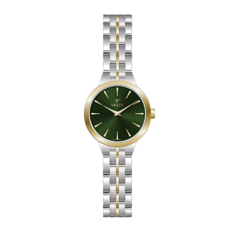 ساعت مچی زنانه ویولت کد 0645/2 با طراحی کلاسیک و صفحه سبز جذاب. دارای قاب استیل ضد حساسیت 28 میلیمتری، مقاومت 5ATM در برابر آب و بند استیل دو رنگ. شیک و بادوام.