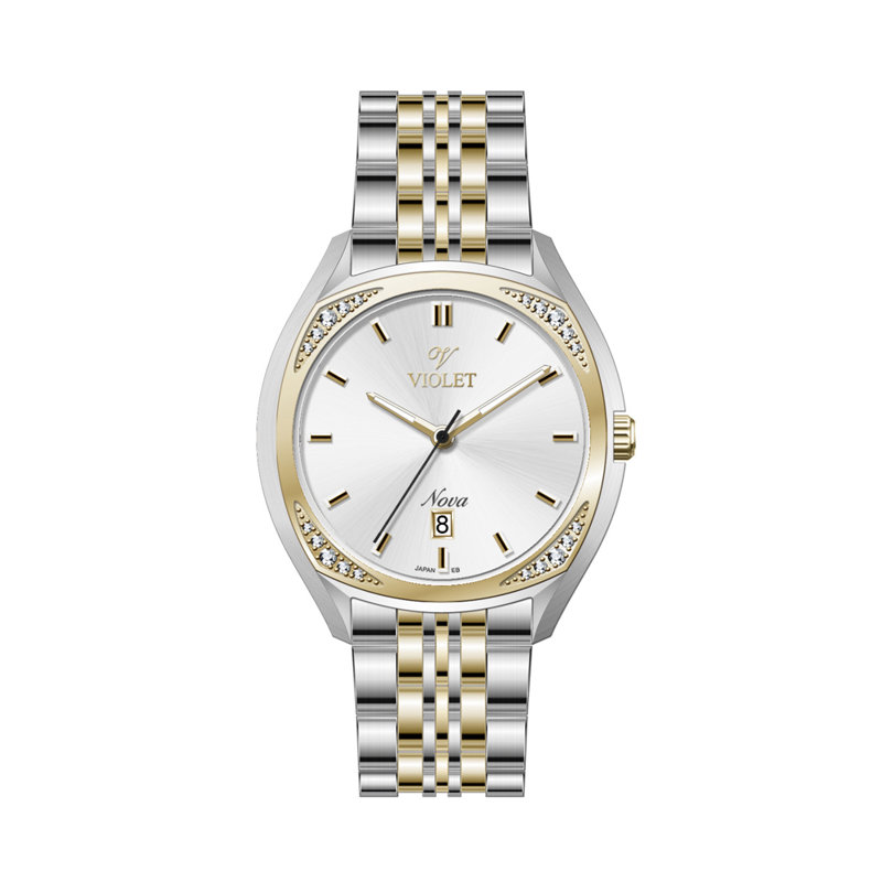 ساعت مچی ویولت، زنانه تک موتوره،گرد فلزی،دو رنگ استیل طلایی،صفحه نقره ای کد 32755/2