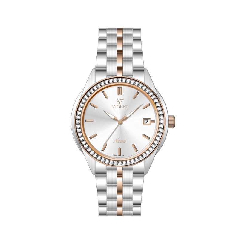 ساعت مچی زنانه ویولت کد 32767/2 با طراحی کلاسیک، قاب گرد 30 میلیمتری و بند استیل دو رنگ (رزگلد و نقرهای). مقاومت در برابر آب 5ATM. مناسب استفاده روزمره و مجالس.