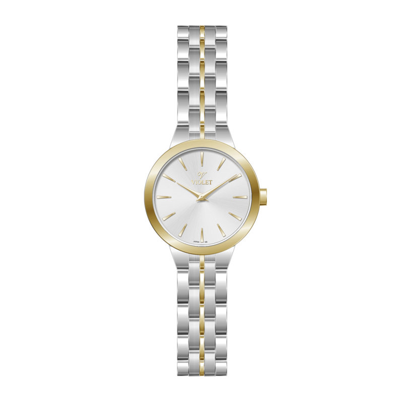 ساعت مچی زنانه ویولت کد 0645/2. طراحی کلاسیک با قاب گرد 28 میلیمتری و بند استیل دو رنگ طلایی. کاملاً ضد حساسیت، دارای مقاومت 5ATM در برابر آب. شیک و مناسب استفاده روزانه.