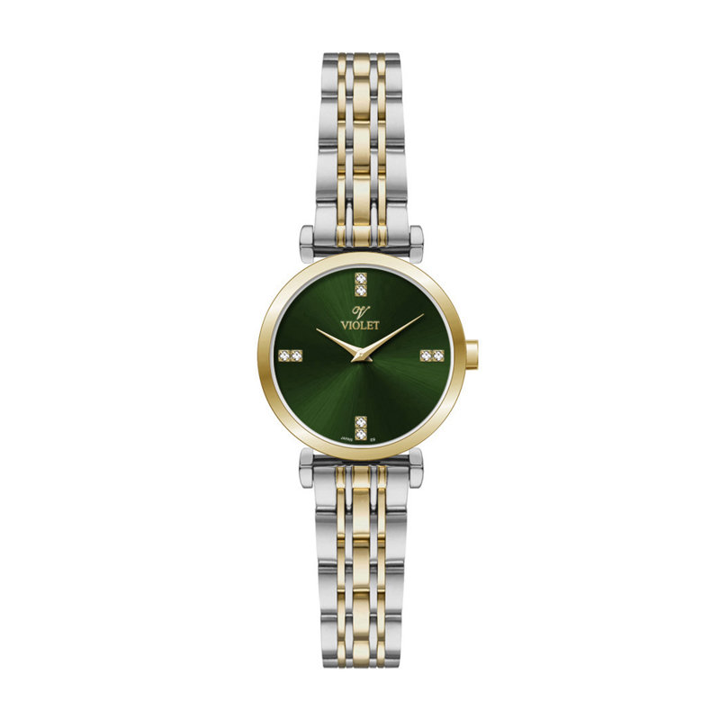 ساعت مچی زنانه ویولت (Violete) کد 0646/2 با طراحی دورنگ طلایی و صفحه سبز. جنس استیل ضد حساسیت، تک موتوره، سایز 26 میلیمتر و مقاومت 5ATM. خرید با بهترین قیمت.