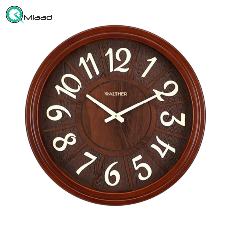 ساعت دیواری والتر Walther مدل 6004 | ساعت دیواری سایز 58 با موتور آرامگرد، بدنه قهوه ای و جزییات طلایی