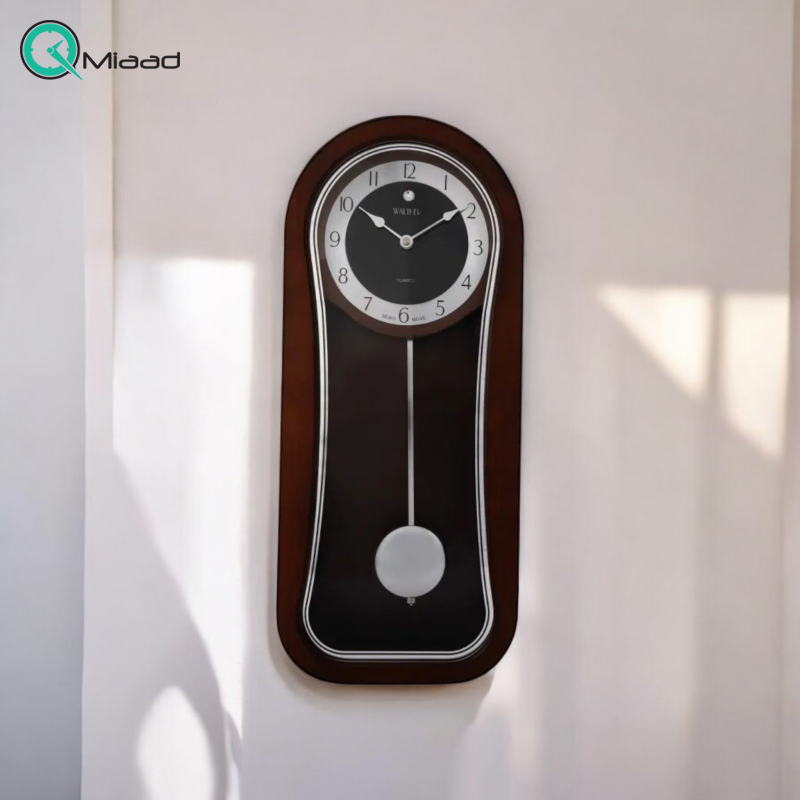 ساعت دیواری والتر مدل K7755، ساعت دیواری پاندول دار ساخته شده تماما چوب، مجهز به موتور بی صدا و مصرف کم باتری، دارای زنگ هوشمند