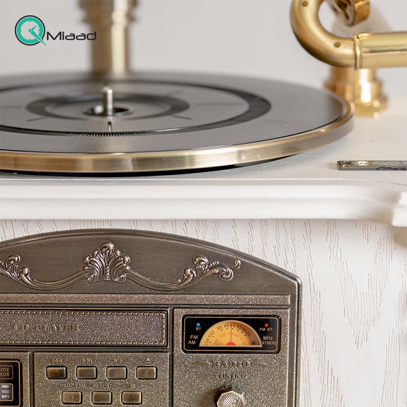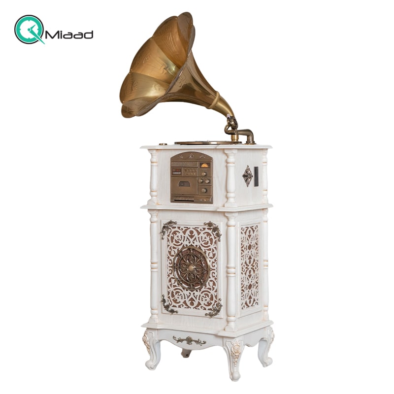 گرام با شیپور بزرگ کلاسیک از جنس پلیمر قابلیت پخش CD-MP3-DVD ورودی درگاه USB قابلیت اتصال از طریق بلوتوث رادیو استریو 2 موج AM/FM قابلیت پخش نوار کاست | گرامافون با قابلیت پخش صفحه با سه سرعت دور ضبط شده،دارای خروجی های صدا و تصویر، دارای ساب ووفر و قابلیت پخش صدا به صورت استریو، دارای صفحه LED جهت نمایش عملیات CD، کنترل از راه دور جهت عملیات تنظیم CD-MP3-DVD، پنل فول