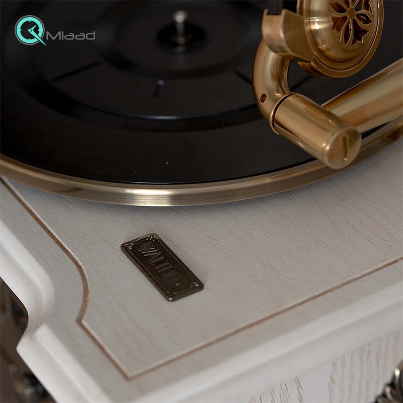 گرامافون ایستاده والتر فول، پخش کننده استریو دارای ساب ووفر، پخش انواع سیدی، دیویدی، نوارکاست، رادیو دوموج، فلش، بلوتوث | گرامافون سه سرعته با شیپور بزرگ طلایی پلیمری نشکن | کد 2511 استخوانی